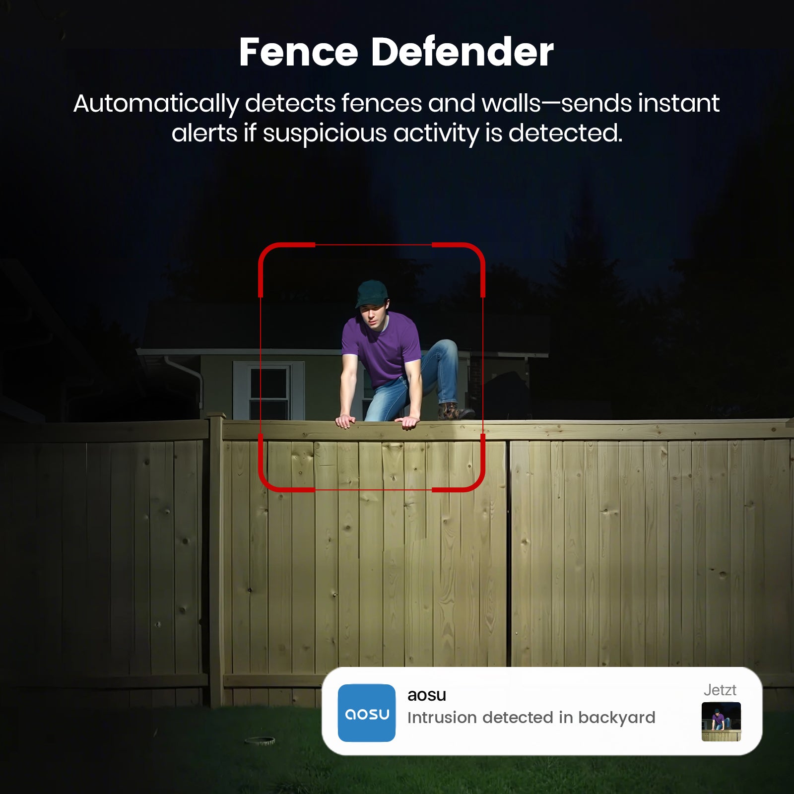 • Smart Fence Perimeter Alarm System: Powered by AI, the wireless security camera automatically detects fences, walls, and vehicles to create a virtual perimeter.