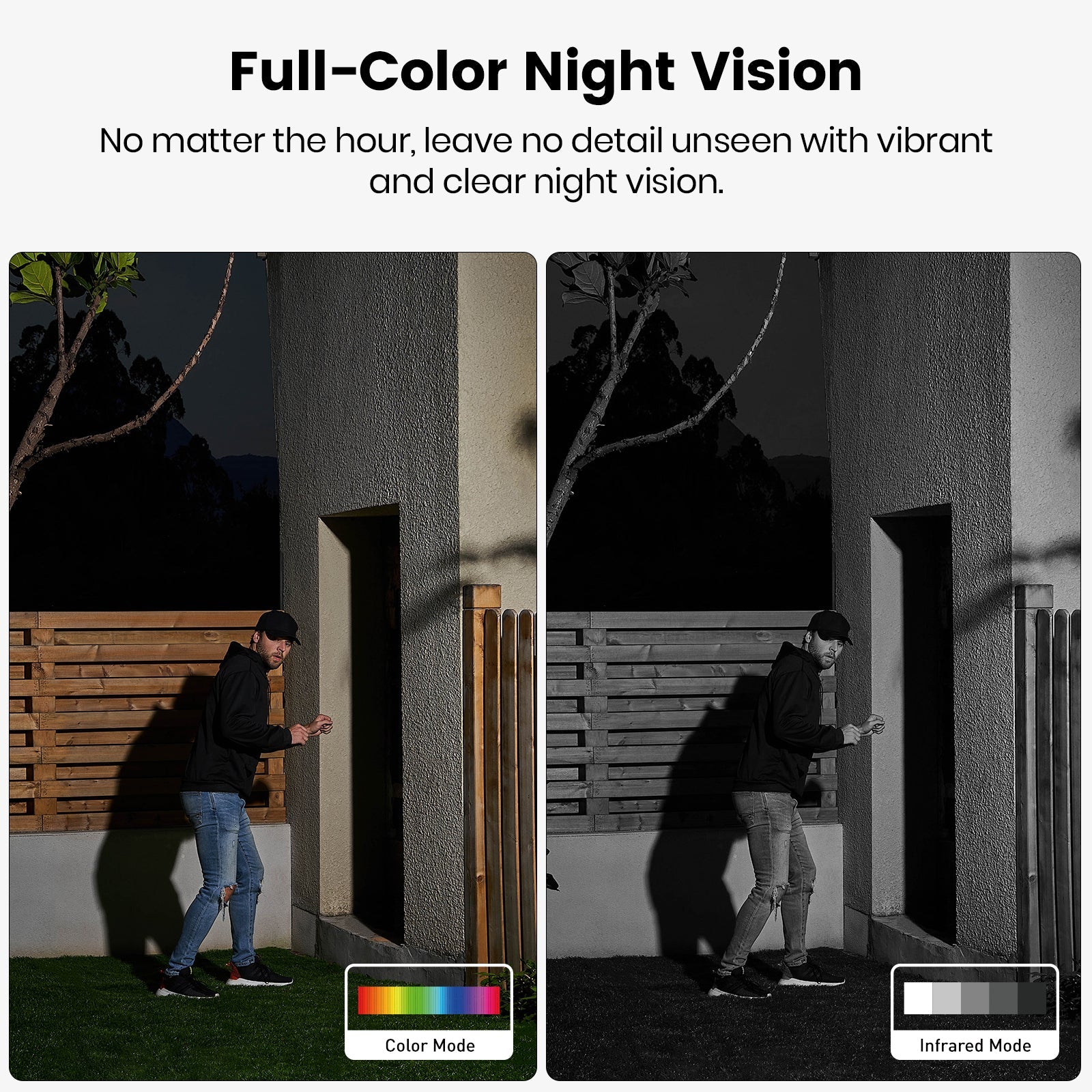 • Full-Color Night Vision: Clear, vibrant images in low light with ultra-low-light sensors and infrared LEDs for full visibility, even in darkness.